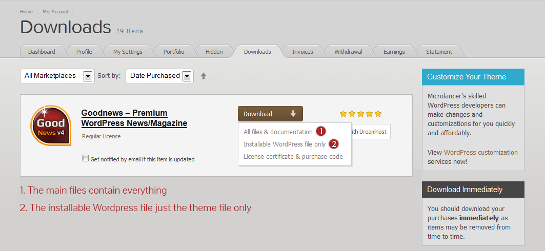 When you purchase our theme from Themeforest, you need to download the Multinews files from your Themeforest account. Navigate to your downloads tab on Themeforest and find Multinews. Click the download button to see the two options. The Main Files contain everything, the Installable WordPress Theme is just the installable WordPress theme file. Below is a full list of everything that is included along with a brief description of each item.